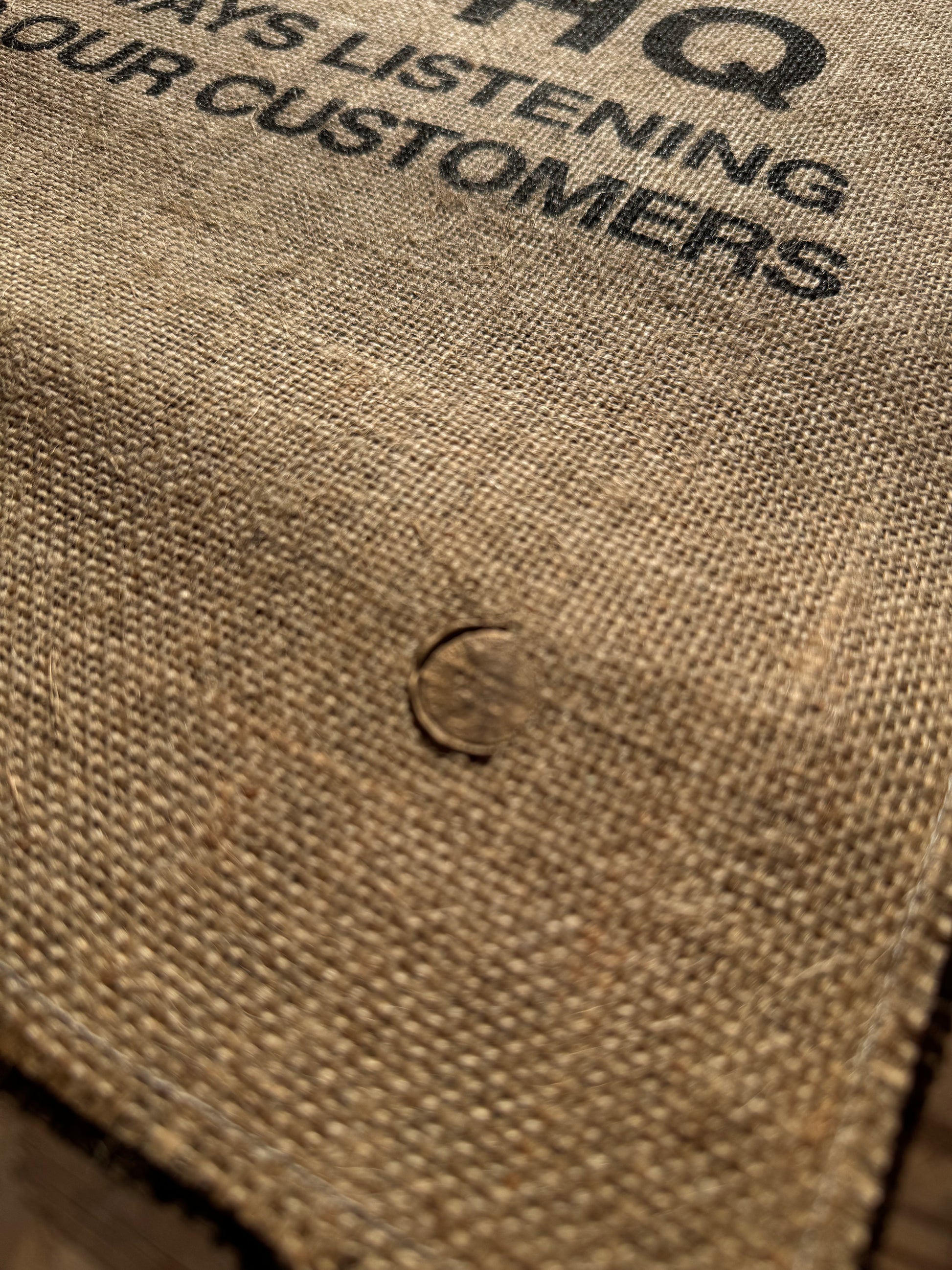 The coffee shop that donated the ex coffee sacks and made the print also sells to employees of nearby GCHQ.