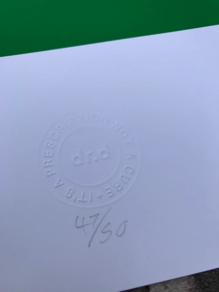 Blind stamped "dr.d it’s a prescription not a cure"
